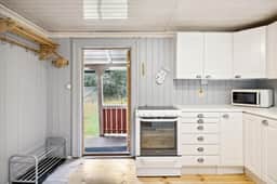 The main chalet, with its traditional wooden interiors, exudes warmth and coziness. The ground floor features a practical layout with a kitchen, living room, and bedroom. The kitchen, with its light gray painted paneling and lacquered wooden floor, is both functional and inviting. A wood-burning stove adds a rustic touch, perfect for those chilly Norwegian evenings.